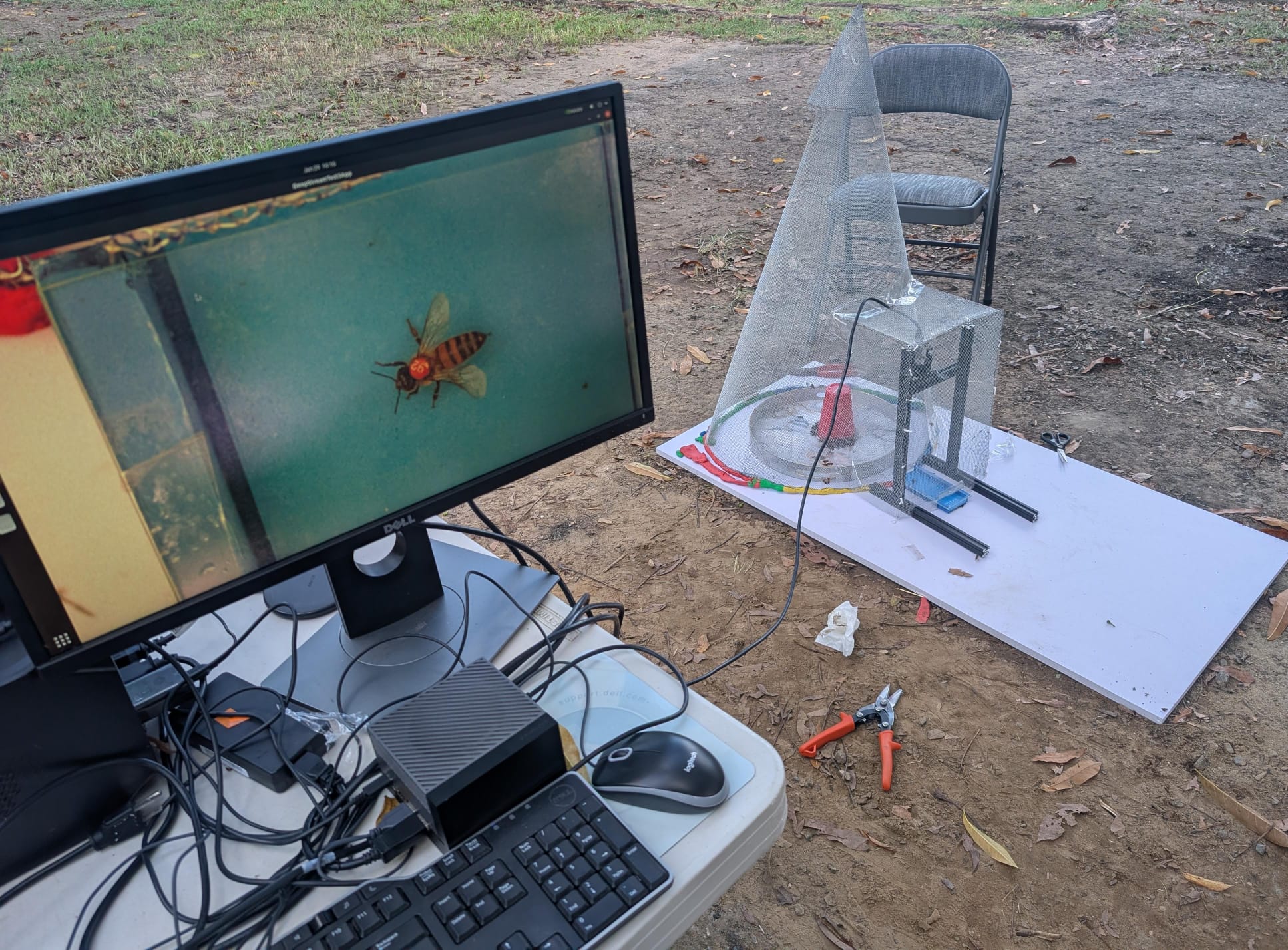 - Una vez terminan de alimentarse, salen del comedero. En este momento, los expertos registran las coordenadas del rumbo que toman las abejas. El departamento de Ciencias de Cómputos mantiene una cámara grabando la entrada del comedero, para luego procesar las capturas y entrenar sus modelos de Inteligencia Artificial.